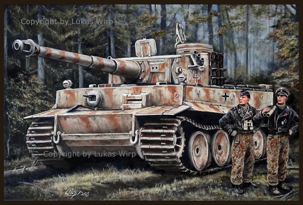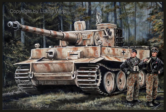 Der Tiger von Hauptsturmführer Wittmann auf dem Weg zur französischen Ortschaft Villers-Bocage im Juni 1944. Wittmann fuhr mit dem Tiger 222 einen waghalsigen Alleinangriff gegen englische Einheiten in dessen Verlauf er insgesamt 9 britische Panzer, 13 Habkettenfahrzeuge, 2 Pak und 6 M5 vernichtete. Dann wurde sein Panzer durch Pak am vorderen Laufwerk beschädigt und musste kurzzeitig zurückgelassen werden. Gegen Abend rückten die deutschen Einheiten vor und konnten den Tiger 222 sichern. Der Militärberufsmaler Lukas Wirp hat den 222 nach Orignalfotos der Zeit gemalt.