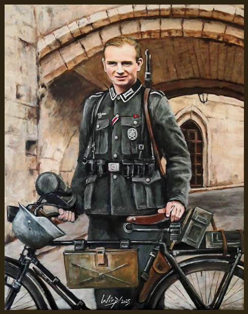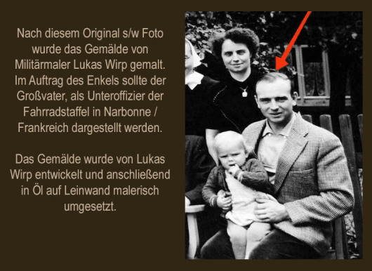 Das Gemälde wurde von Lukas Wirp im Auftrag des Enkels als Erinnerung an den Großvater gemalt. Hier als dargestellt Unteroffizier der Fahrradstaffel in Frankreich.