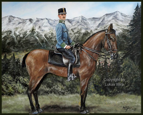Gemälde von Militärmaler Lukas Wirp im Auftrag des Enkels eines Rittmeisters der KuK Tiroler Landesschützen (Kaiserschützen). Dargestellt auf seinem Regimentspferd vor den Innsbrucker Bergmassiven. Das Motiv wurde nach Original s/w Fotos der damaligen Zeit detailgetreu umgesetzt. Auch der Rittmeiseter wurde entprechend portraitiert. Öl auf Leinwand im Format 80 x 60 cm.