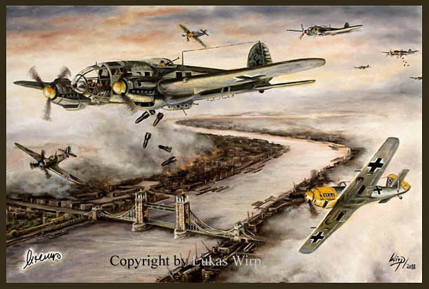 Die Luftschlacht über England des Kriegsjahres 1940. Hier dargestellt ein Angriff von Heinkel HE111 Bombern mit Begleitjägern BF109 auf die Hauptstadt London. Auch genannt "The Blitz". Nach Erzähluingen des Ritterkreuzträgers und Piloten Oberleutnant Gerhard Krems vom Kampfgeschwader KG27 hat Militärkunstmaler Lukas Wirp die Darstellung der 2. Angriffswelle auf die englische Hauptstadt am 7. September 1940 gemalt. Das Gemälde wurde zu Lebzeiten von Oberleutnent Krems persönlich signiert.
